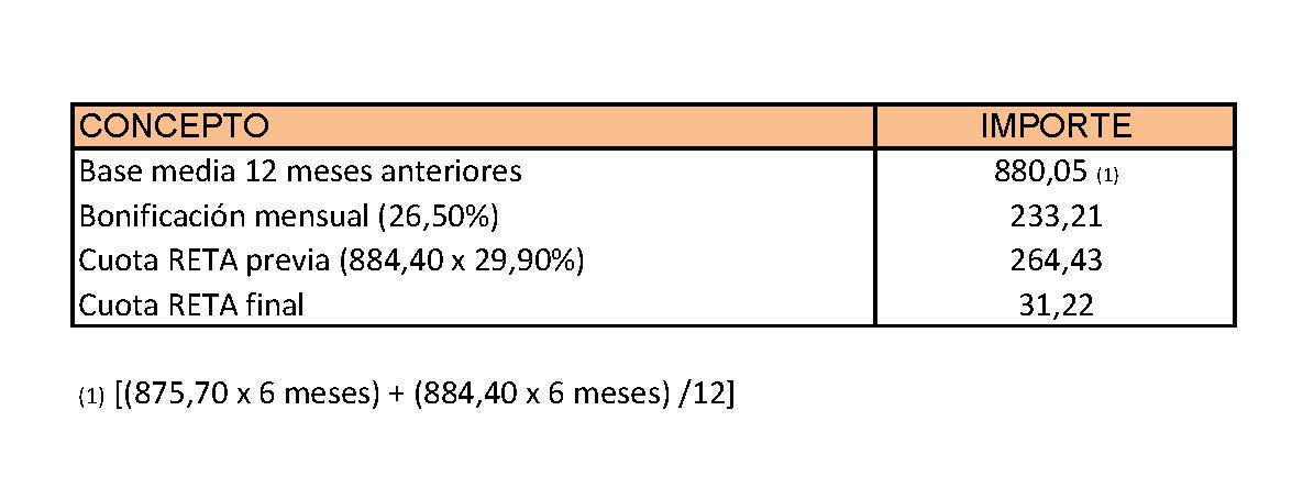 Ejemplo: Autónomo que contrata a un empleado a tiempo completo el 1 de junio y que durante los 12 meses anteriores ha cotizado en el RETA por base mínima: